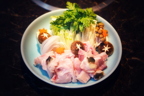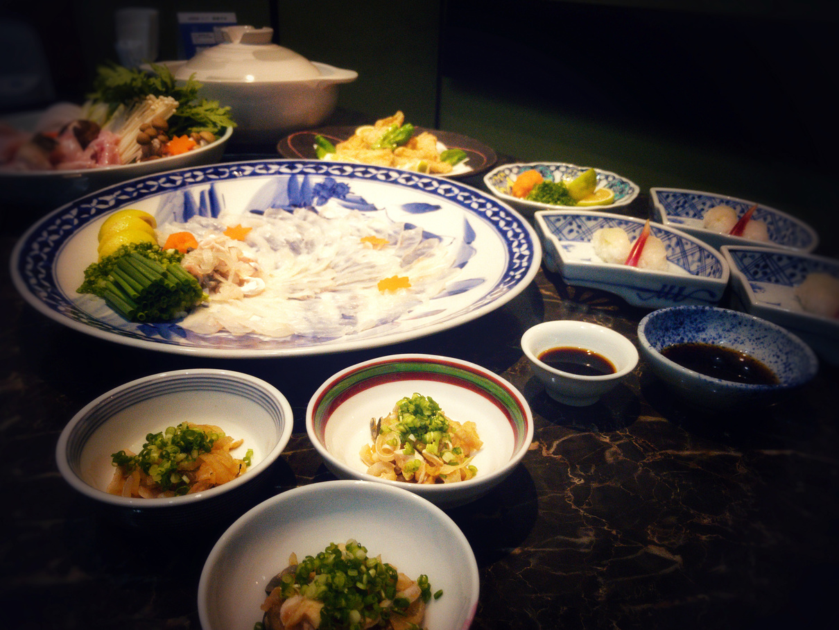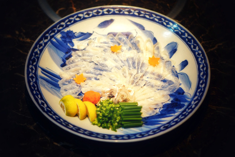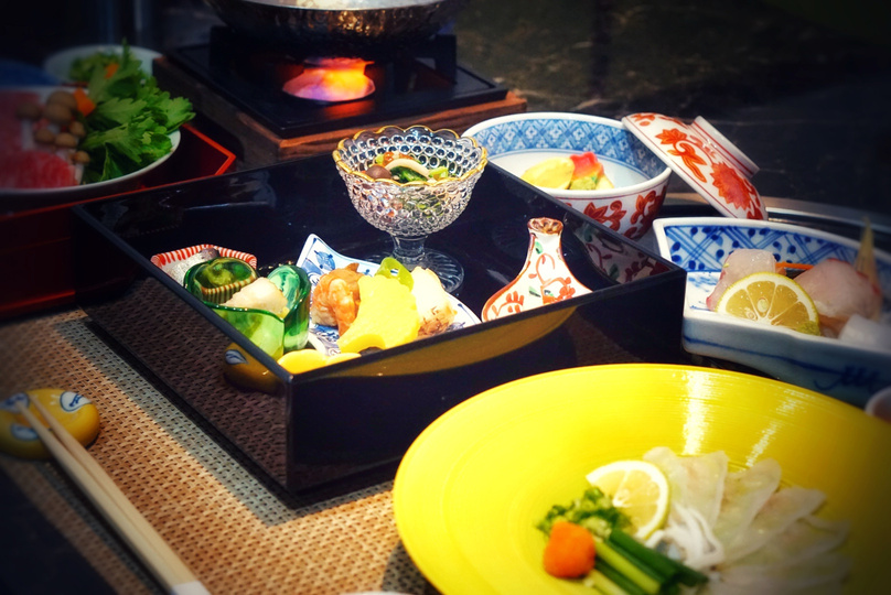 彩箱、ふぐ刺し、お造り、 蓋物、焼き物、牛ステーキ、ご飯物