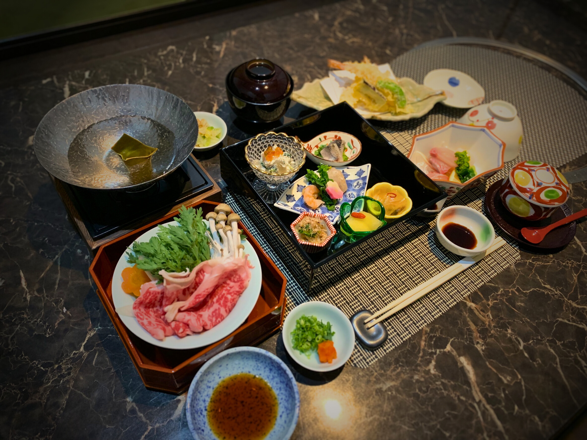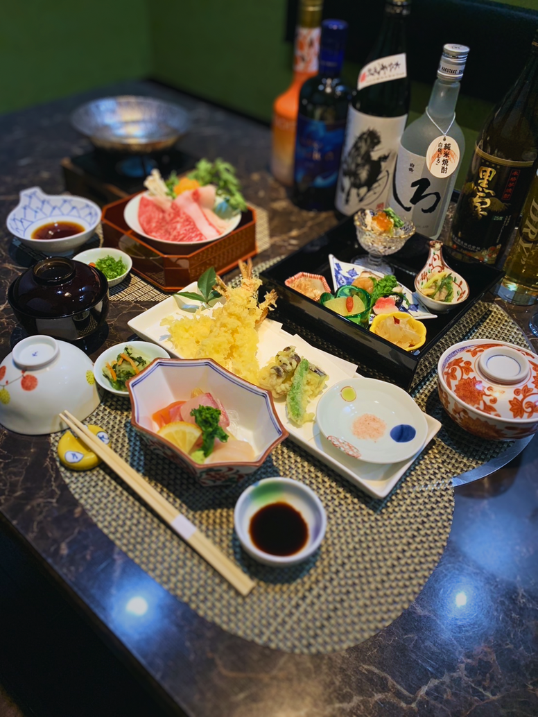 天ぷら、お造り、茶碗蒸し、彩箱、汁物、香の物、白飯、牛しゃぶ