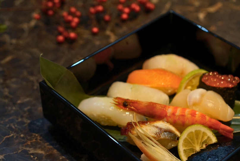 箱前菜、天ぷら、茶碗蒸し、握り寿司、汁物